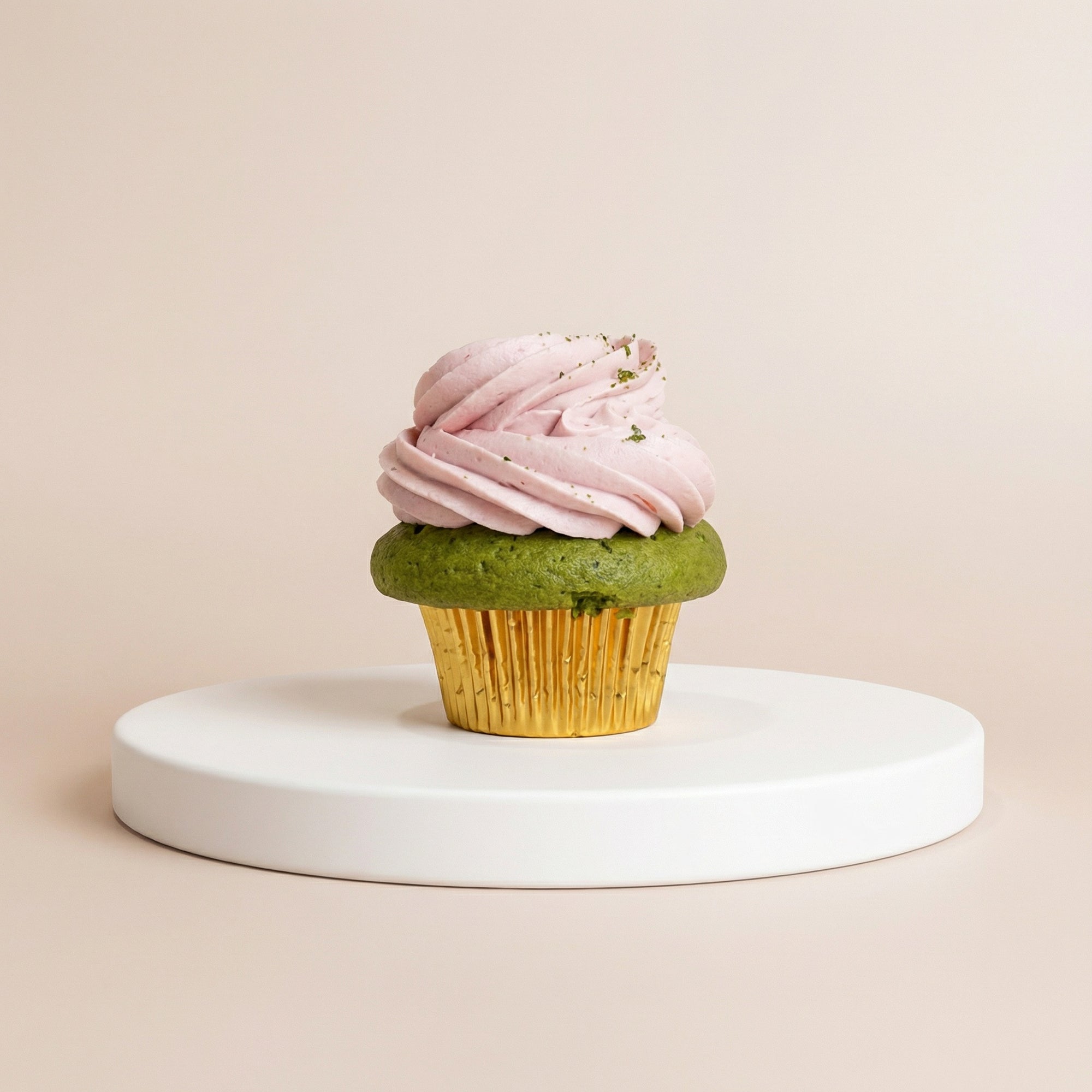 Delicate matcha cupcake topped with house-made strawberry buttercream and a dusting of pure matcha powder. A harmonious blend of earthy green tea and sweet berries in every bite.